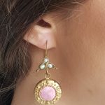 Earring gold plated in 18k with natural garnet, turquose, pearl.